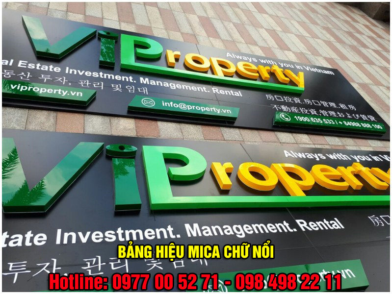 - Bảng quảng cáo mặt bạt hiflex gắn chữ Mica nổi (trong trường hợp Biển có hình ảnh, phần chữ chính được gắn nổi).
