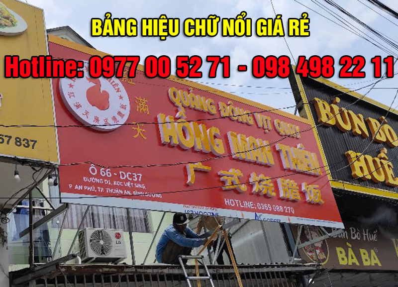 Ngày nay, bảng hiệu quảng cáo chữ nổi giá rẻ đang được ưu tiên sử dụng tại các cửa hàng, cơ sở kinh doanh, nhà hàng... Loại bảng hiệu này thể hiện nhiều ưu điểm nổi bật và mang tính thẩm mỹ cao. Quảng Cáo Bình Dương với kinh nghiệm 10 năm trong lĩnh vực quảng cáo đã giúp bảng hiệu quảng cáo của chúng tôi có nét đặc trưng và nổi bật riêng.