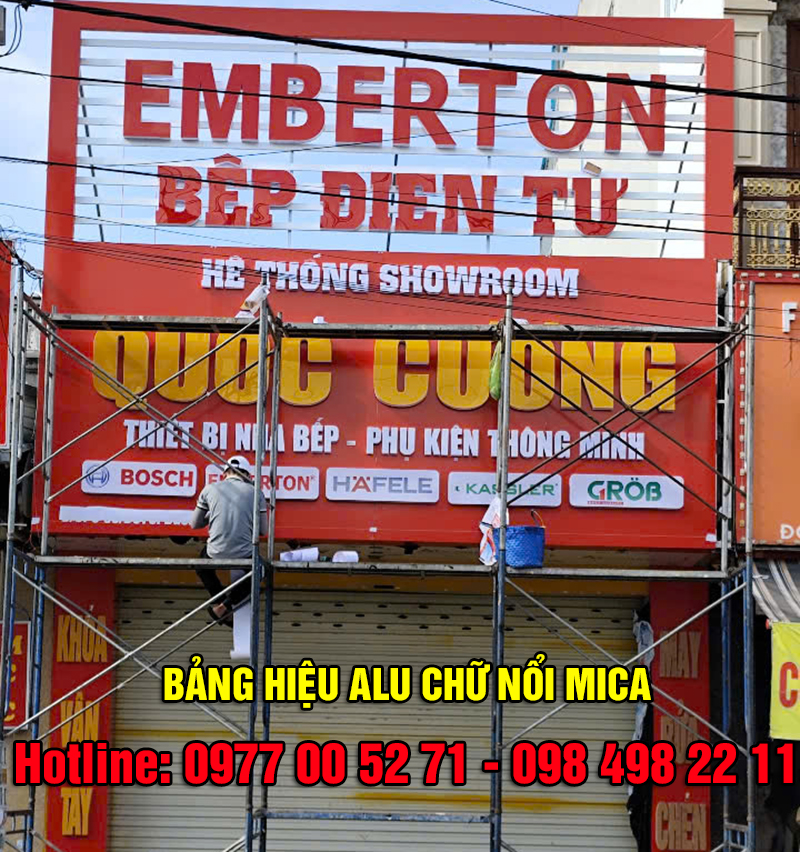 – Nội dung chữ nổi: Có thể kết hợp với chất liệu Mica, Inox..Sự kết hợp này tạo nên sự hoàn mỹ cho bảng hiệu Alu. Tuy nhiên, bạn cần kết hợp màu sắc sao cho hài hòa, nội dung ngắn gọn súc tích nhưng vẫn tạo được điểm nhấn thu hút khách hàng và tăng tính chuyên nghiệp.