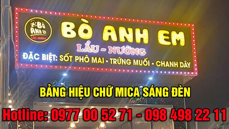 Làm bảng hiệu quảng cáo đang là nhu cầu của nhiều đơn vị kinh doanh hoặc cung cấp các dịch vụ khác nhau. Có rất nhiều các loại chất liệu để làm các bảng hiệu như: hiflex, Alu, mica,... Nhưng để tăng tính thẩm mỹ và sự nổi bật cho các sản phẩm bảng hiệu thì các bảng hiệu chữ nổi mica đèn led đang ngày càng được ưa chuộng.