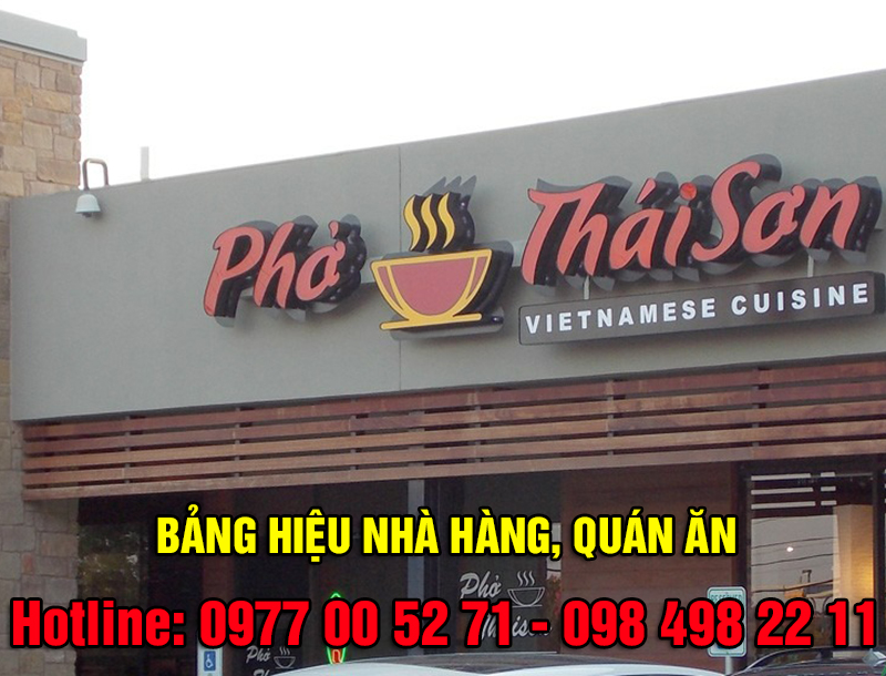 - Bảng hiệu quán ăn, nhà hàng chủ yếu dùng các vật liệu bằng Hiflex, gỗ, hay alu, mica, inox ăn mòn… Có thể là chữ mica, chữ có đèn led,…