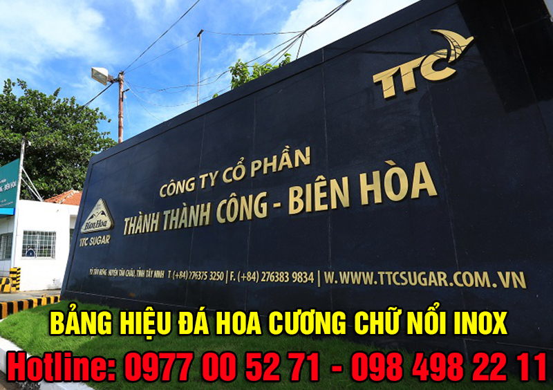 Đây là loại bảng hiệu sử dụng đá hoa cương (granite) làm nền chính, kết hợp với chữ inox (inox vàng, inox trắng, inox xước…) được gia công nổi hoặc âm.