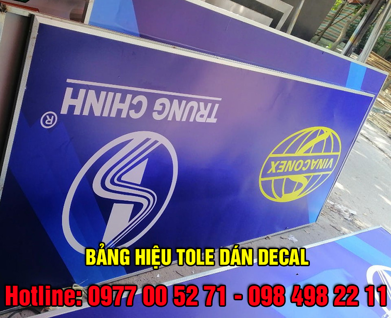 Bảng hiệu tole dán Decal hiện đang là bảng hiệu quảng cáo ngoài trời được nhiều người ưa chuộng. Với kết cấu là khung sắt mà thường là hình vuông hoặc chữ nhật, thanh khung được hàn có sơn tĩnh điện, tole được gắn với khung sắt bằng vít và bề mặt là nội dung được in bằng Decal thì bảng hiệu tole dán Decal không những có tính bền bỉ về chất lượng mà tính thẩm mĩ và giá thành cũng được đảm bảo.