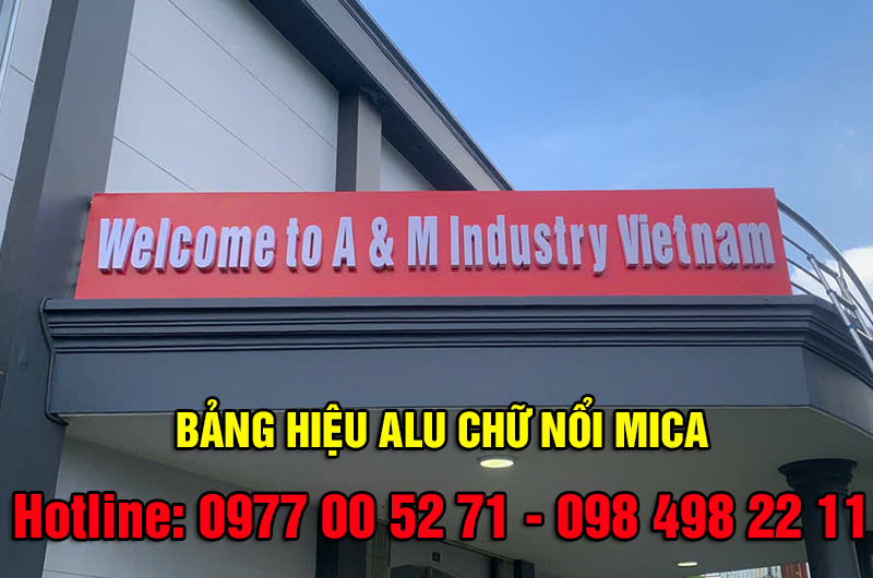 Bảng hiệu alu chữ nổi mica hoặc chữ nổi alu, chữ nổi inox được trang trí gắn trên một mặt dựng bằng alu. Bảng hiệu được cố định bởi các khung sắt vuông và tấm alu gắn trên khung sắt vuông làm bảng hiệu, sau đó trang trí các dạng chữ nổi bằng mica hoặc alu, inox để trang trí.